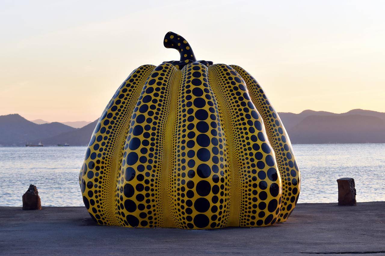 Ses deux oeuvres les plus célèbres, une citrouille rouge et une citrouille jaune trônent sur les côtes de Naoshima.